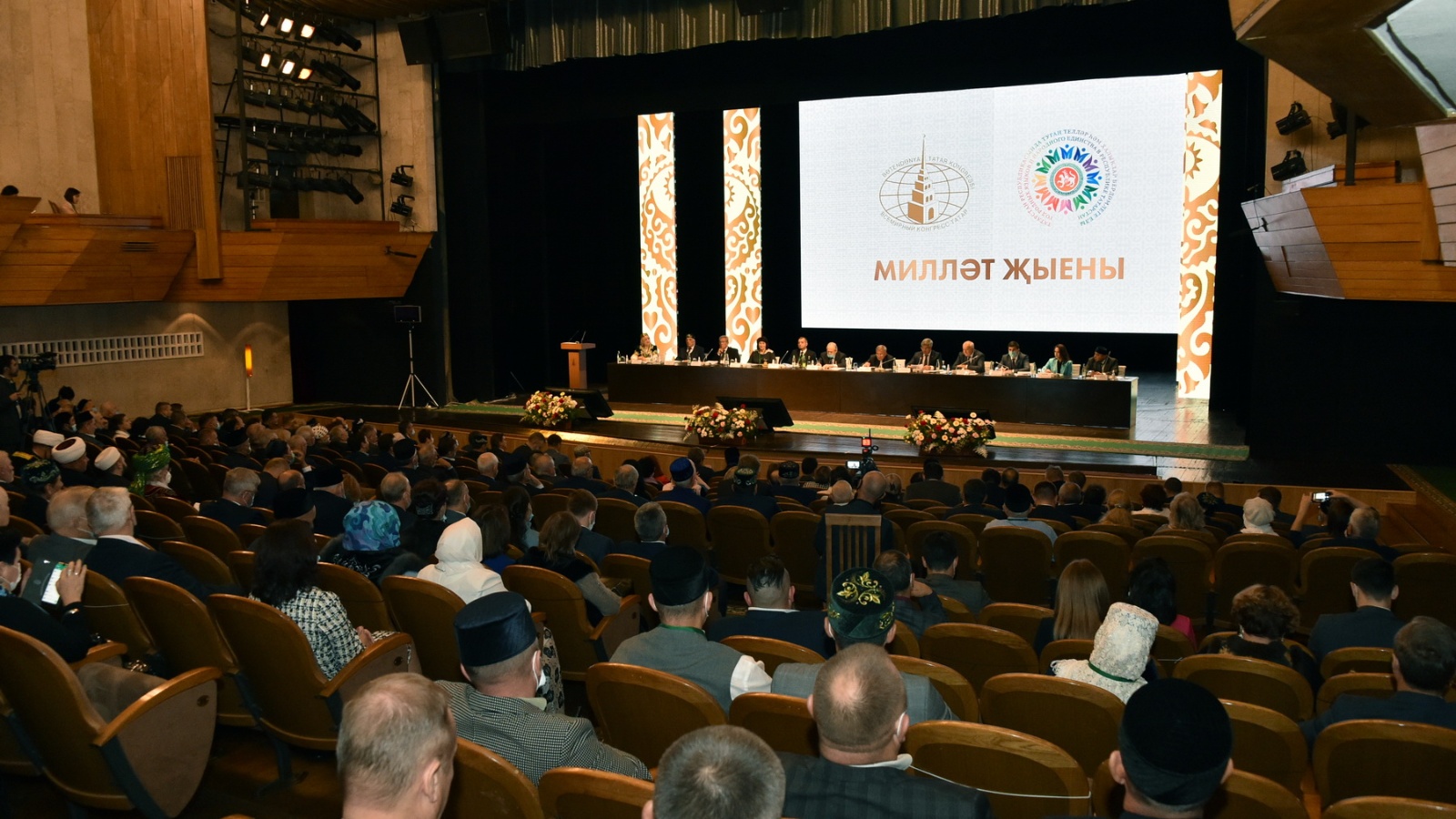 Мы, делегаты Национального схода татарского народа, представляющие 64 региона и 10 стран проживания, едины в своем стремлении к сохранению национальной самобытности, родного языка и культуры своего народа.